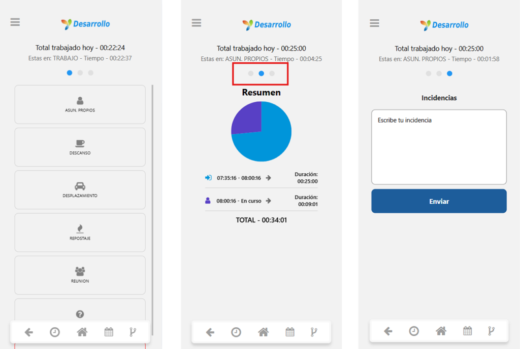 Da questa schermata, gli utenti gestiscono le diverse registrazioni di ingresso/uscita giornaliere. Per registrare una variazione di attività, è sufficiente cliccare sul pulsante corrispondente (ad esempio, Pausa, Viaggio, Riunione, ecc.).